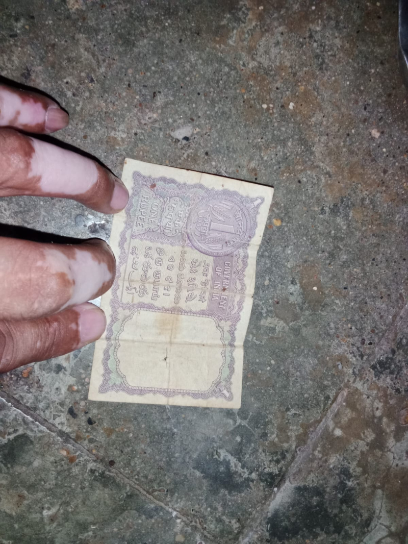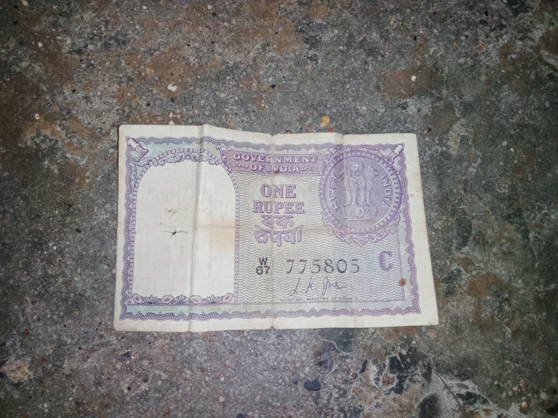 This is an Indian one-rupee banknote issued by the Government of India. It features "ONE RUPEE" in English and Hindi, along with the Ashoka Pillar emblem. The serial number "W67 775805 C" is visible, and it bears the signature of the Secretary, Ministry of Finance (likely H.M. Patel, given the visual cues). The note has a purple design and appears to be in circulated condition.