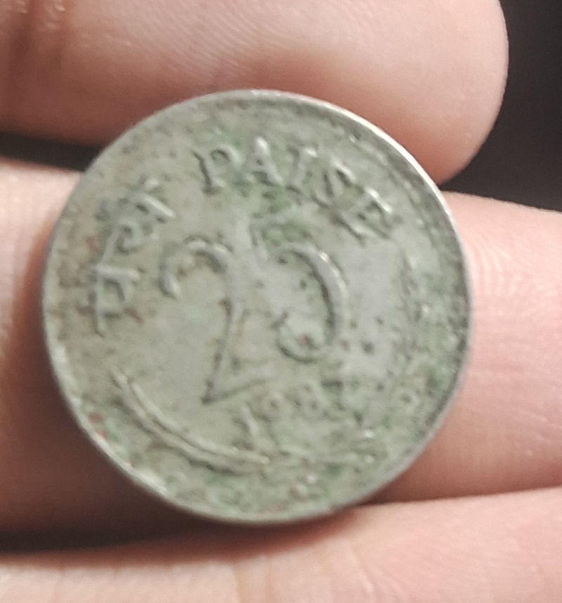 Vintage 1987 25 Paise coin from Kolkata Mint (no mint mark). Made of copper-nickel, this coin features the Lion Capital on the obverse and the denomination with year on the reverse. Ideal for collectors seeking 1980s Republic India series coins. Circulated with natural wear and some toning; no visible mint errors. Enhance your collection with this classic decimal era coin. Shipping charges if any should be paid by the buyer.
