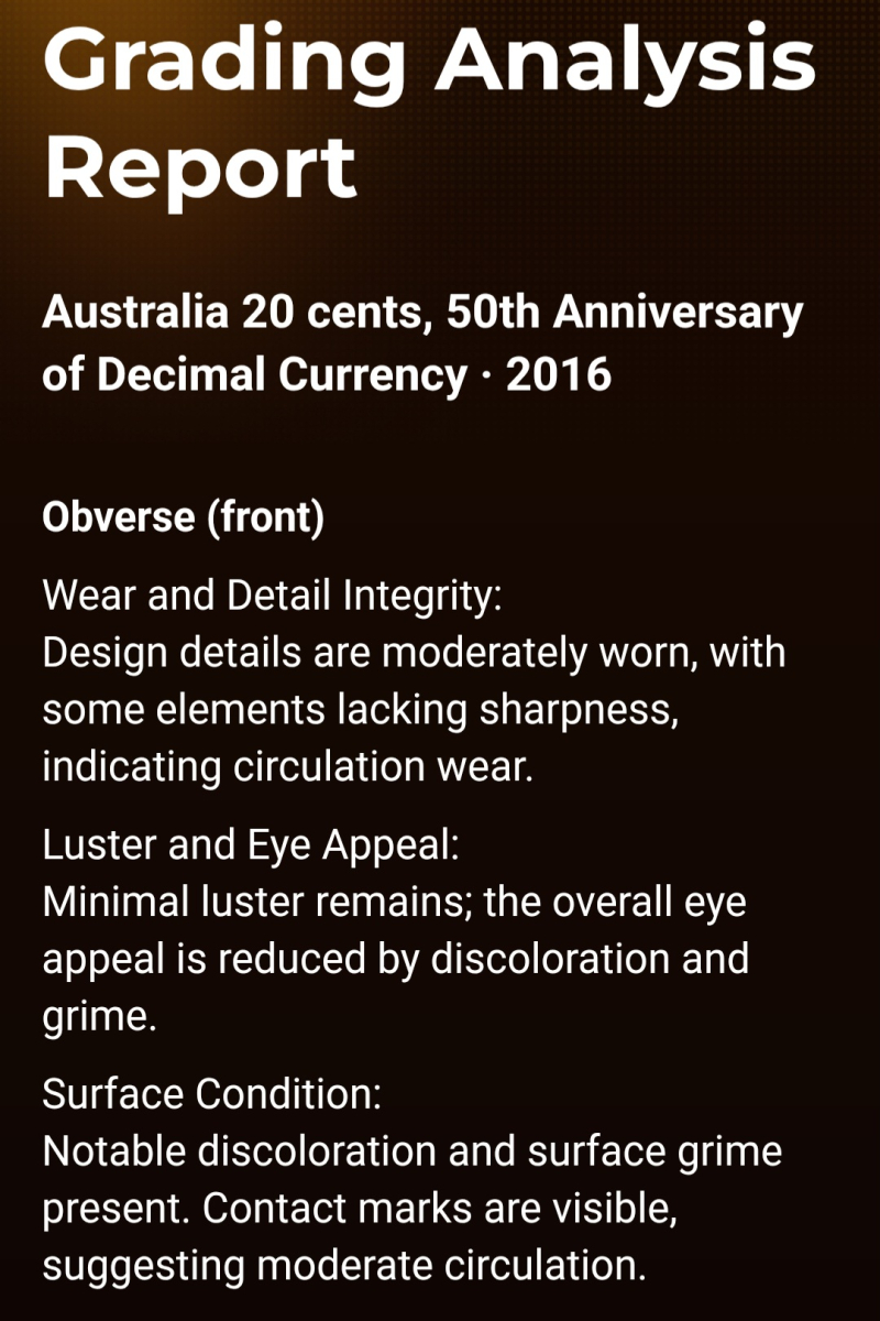 2016 Australian 20 cent ,50th Anniversary of Decimal currency VF-30