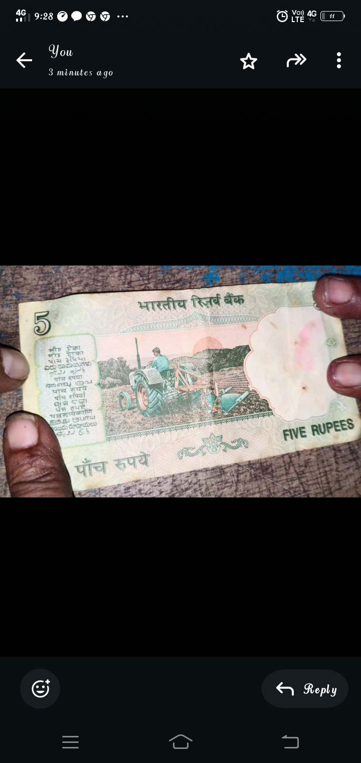 5 rupee's note with tracter and formar