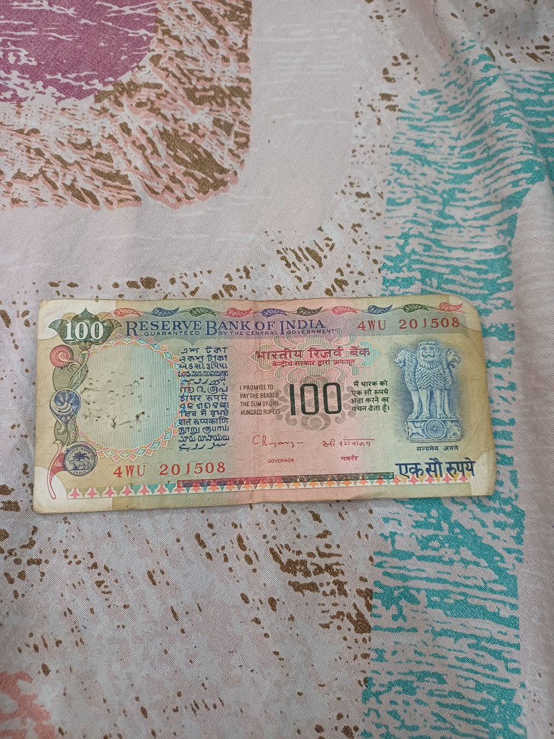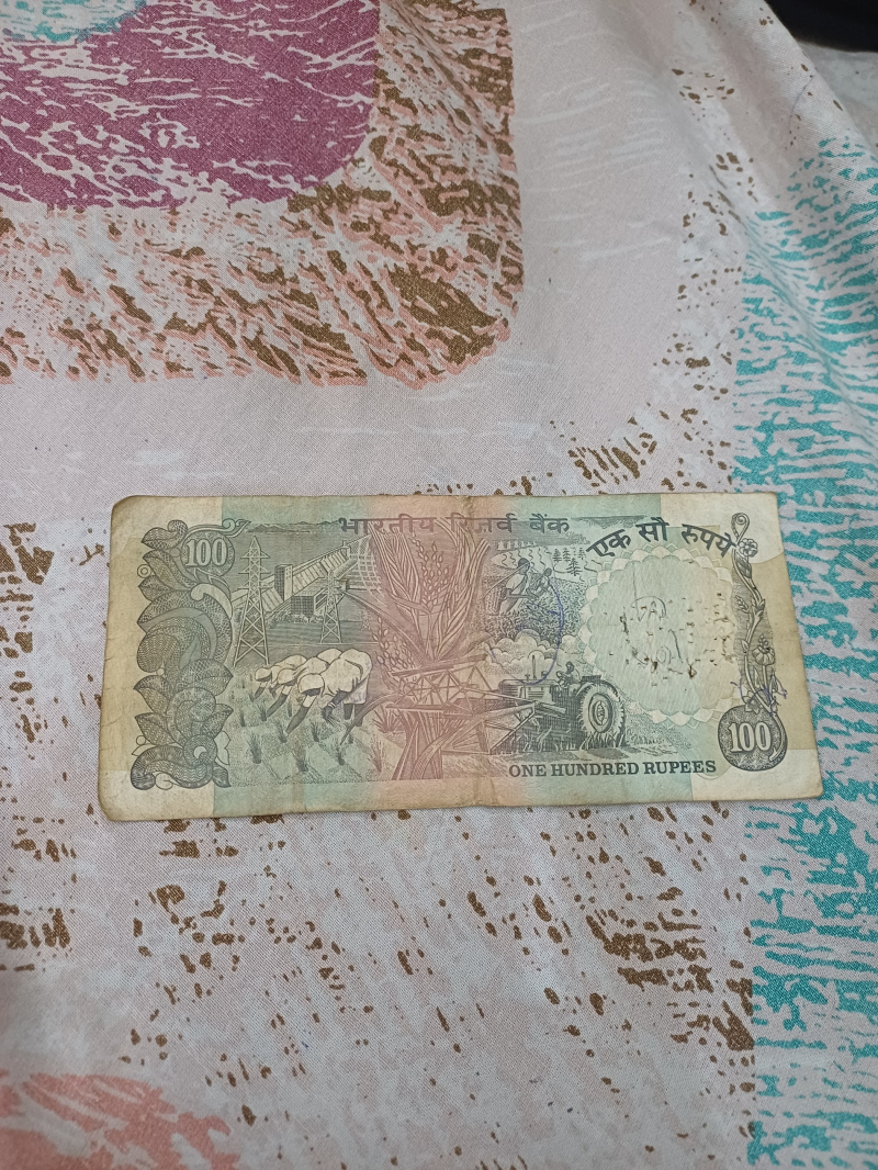 This is a vintage ₹100 Indian banknote that carries a strong old-school charm. The note features a soft pastel palette of beige, pink, green, and blue, giving it a classic, almost antique look. At the center is a large blank watermark circle, showing signs of age with visible pinholes and wear that tell its story over time.