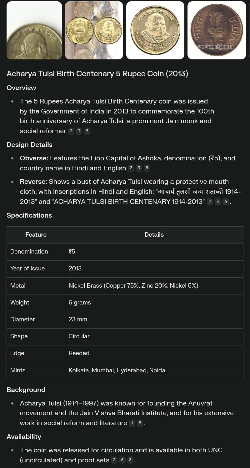 Acharya Tulsi Centenery 5 Rupee Coin EXTREEM FINE ( ORIGINAL IMAGE OF