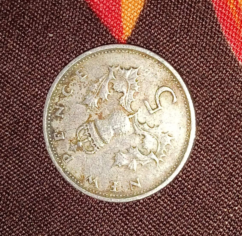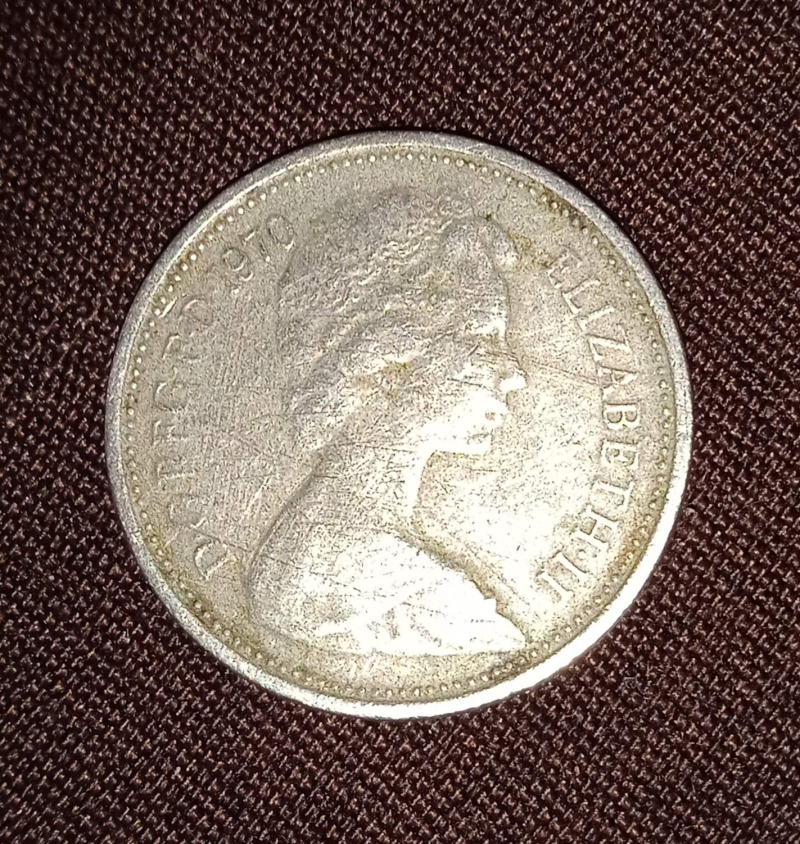United Kingdom 5 pence 1970 Elizabeth The reverse features part of the Crest of England, specifically a royally crowned lion passant guardant, with the text "NEW PENCE" above it.
