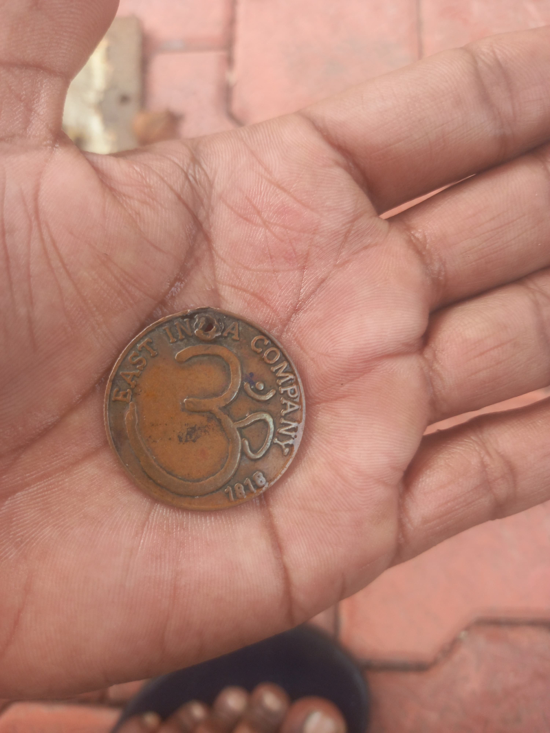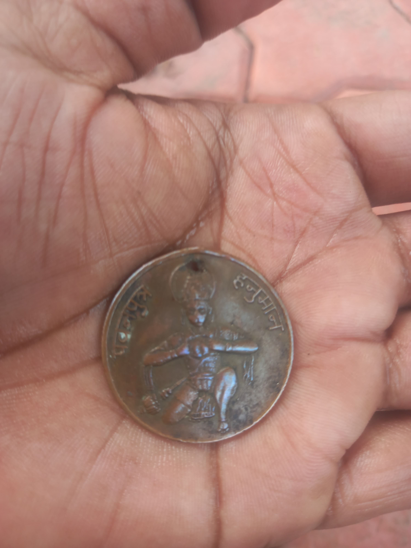 This coin is very old and has Hanuman written on the front and Om written on the back.