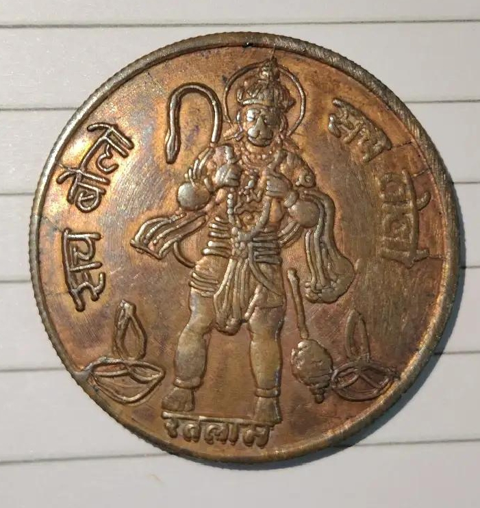 copper temple token featuring the Hindu deity Hanuman.