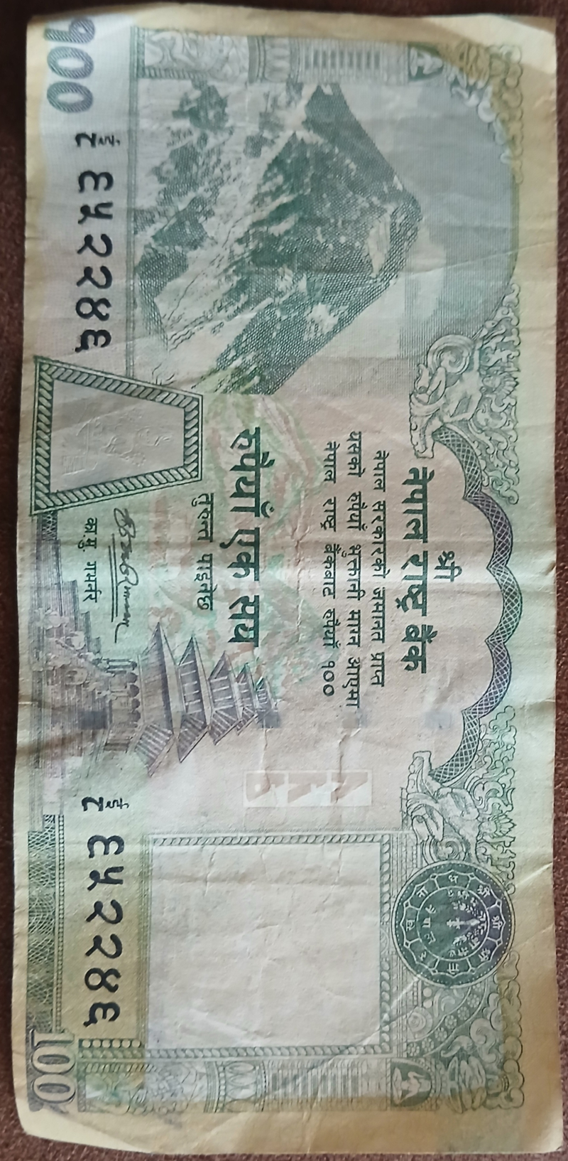 Mount Everest with clouds, Mayadevi temple in a silver metallic oval, a map of Nepal, the Ashoka pillar, and wood carvings from the temple of Taleju in Kathmandu.