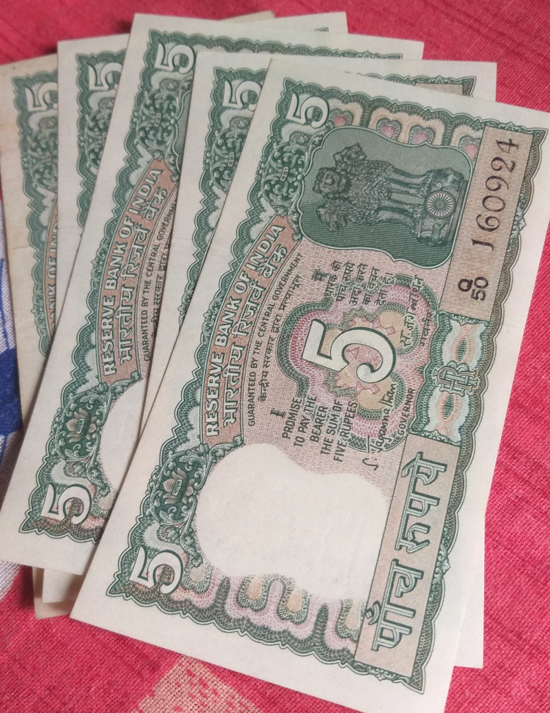 Governor s . jagannathan 5rupees note in very fine condition sale . 5pcs serial no in cheap price