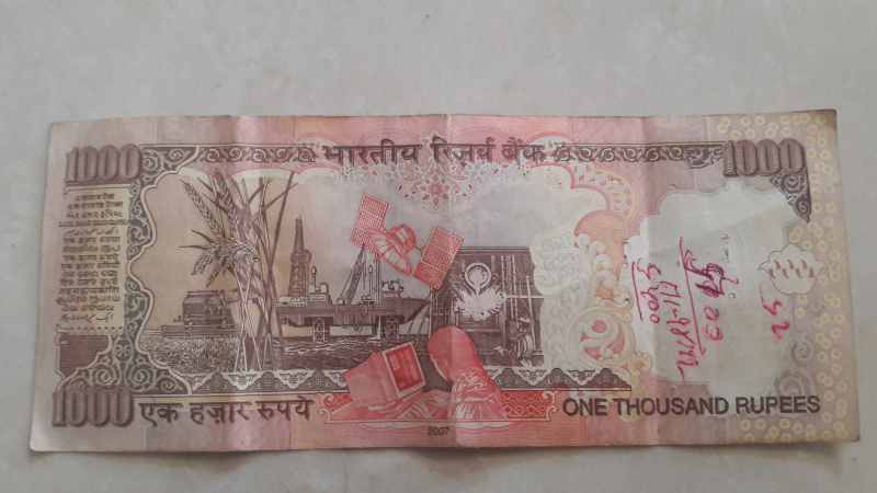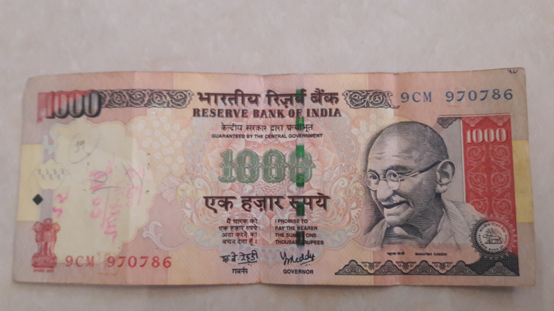 Selling a rare ₹1000 Indian currency note with a unique and lucky serial number ending in 786 (Serial: 9CM 970786).