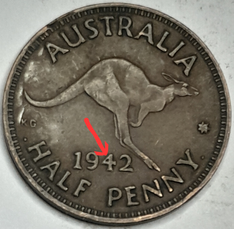RARE ERROR, 1942-I . Y Australian 1/2 penny, VF-25(very fine)