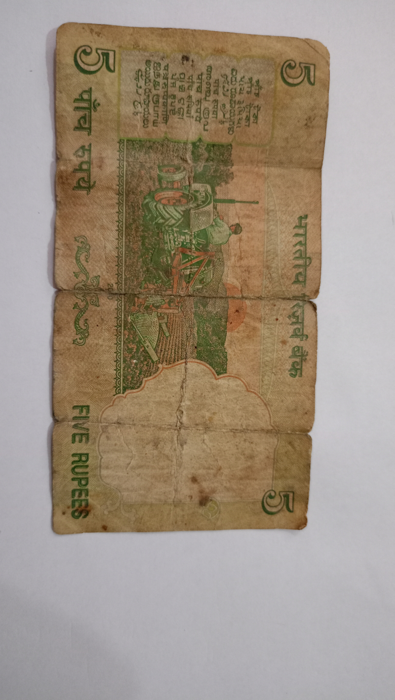 Old rs5 note with farmer on tracter, 17 languages and Gandhi photo guarented by Central Government of India.