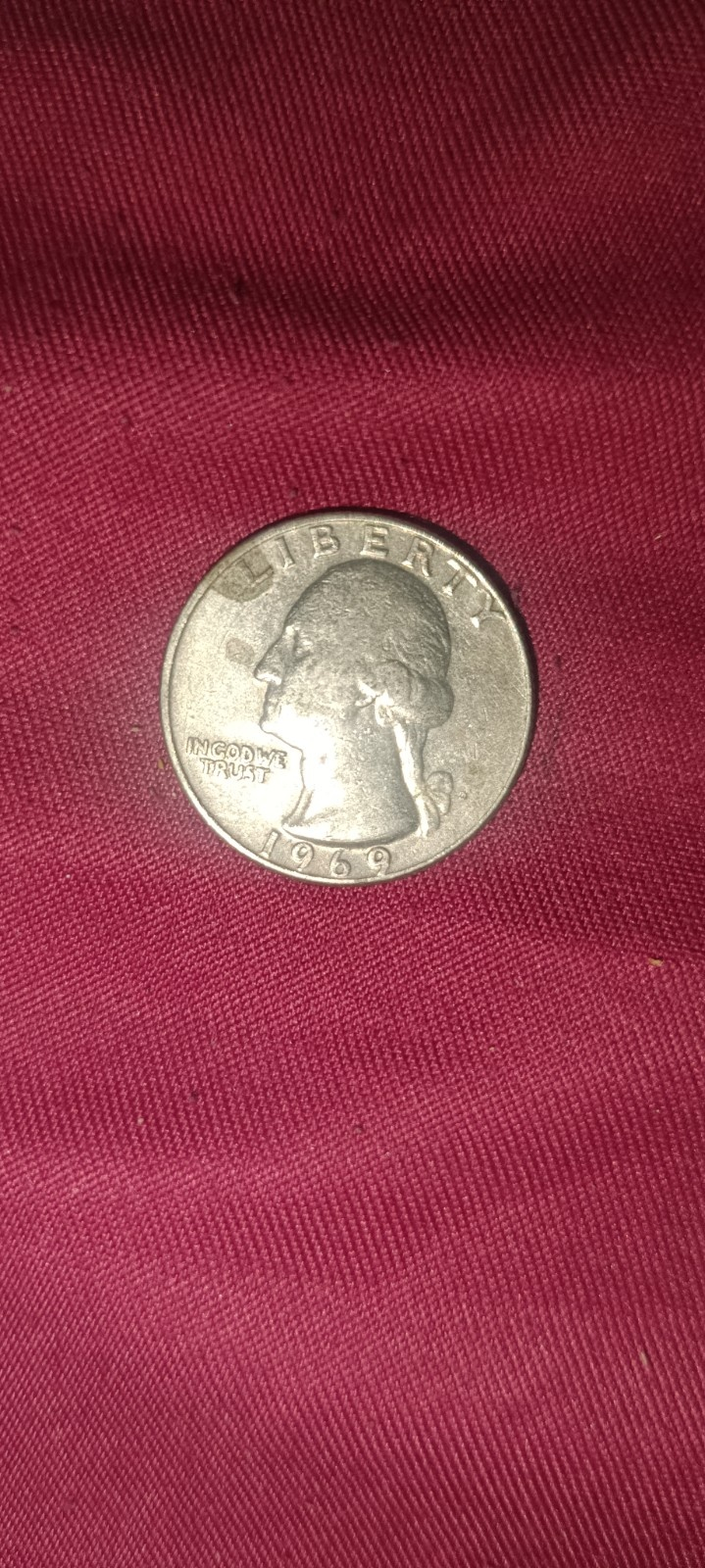 ? 1969 US Washington Quarter – Vintage collectible coin featuring George Washington on the front and an eagle on the back. Authentic 25-cent American coin, over 50 years old. A great piece for collectors and history lovers.