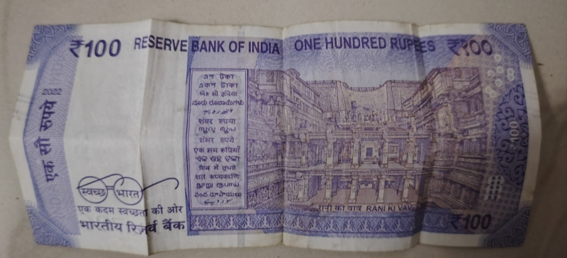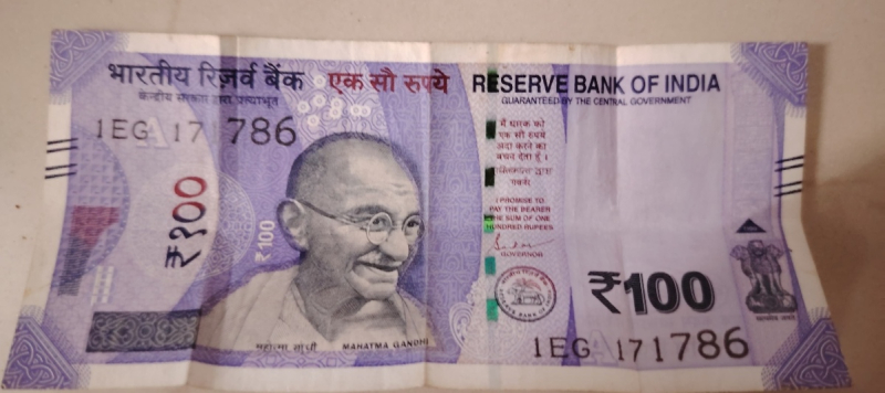 This is an original Indian ₹100 currency note featuring Mahatma Gandhi, issued by the Reserve Bank of India.
