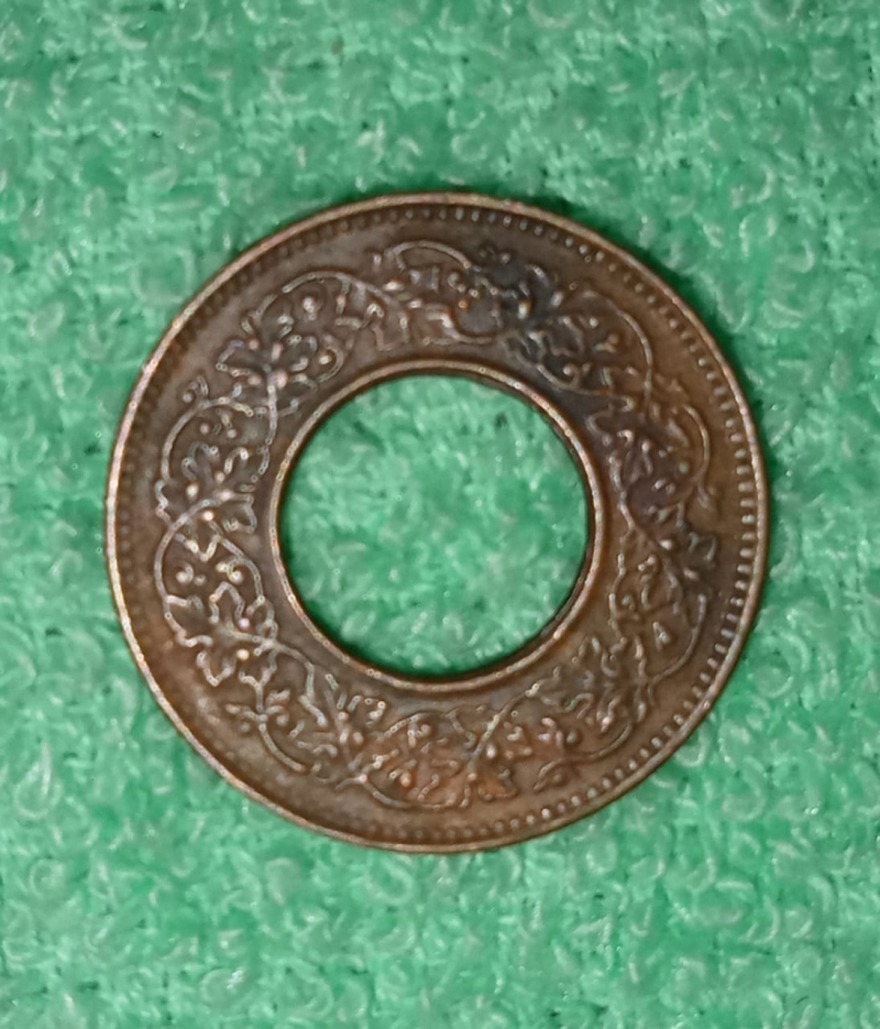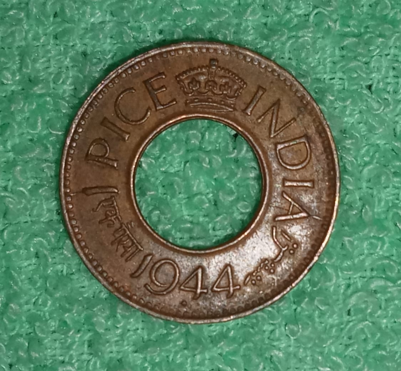 This coin is a 1 Pice from British India, minted in 1944 during the reign of King George VI. It features a distinctive central hole and trilingual inscriptions (English, Hindi, and Urdu).