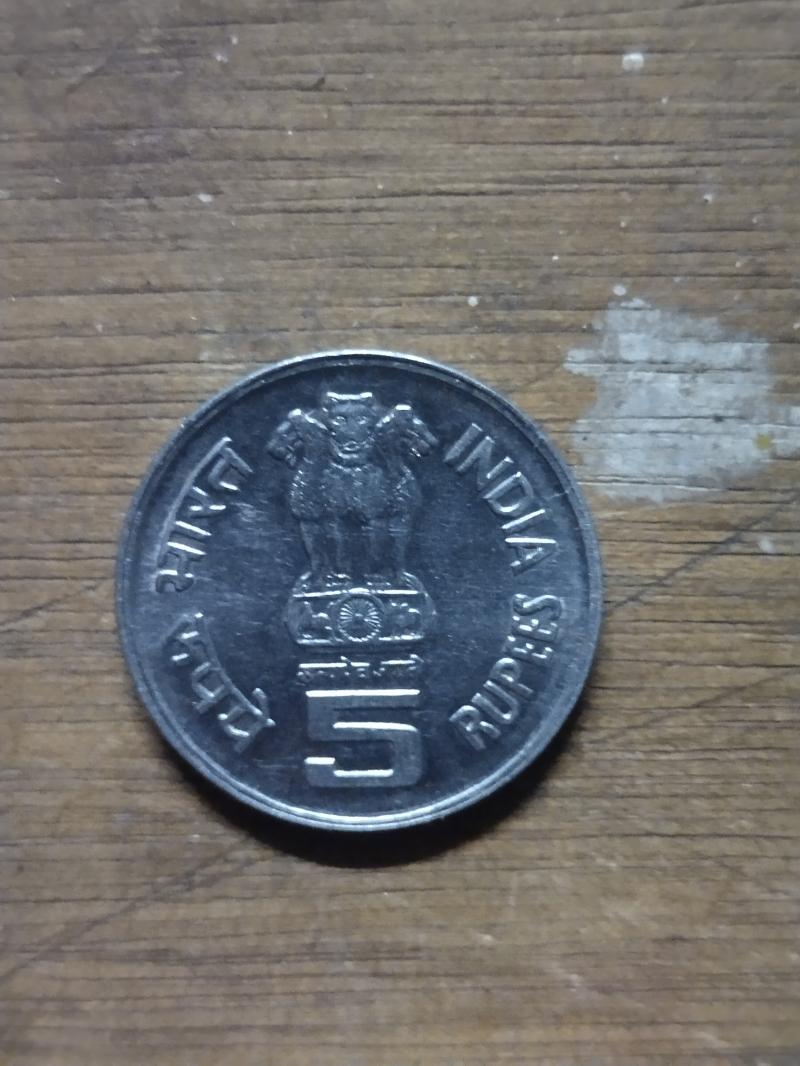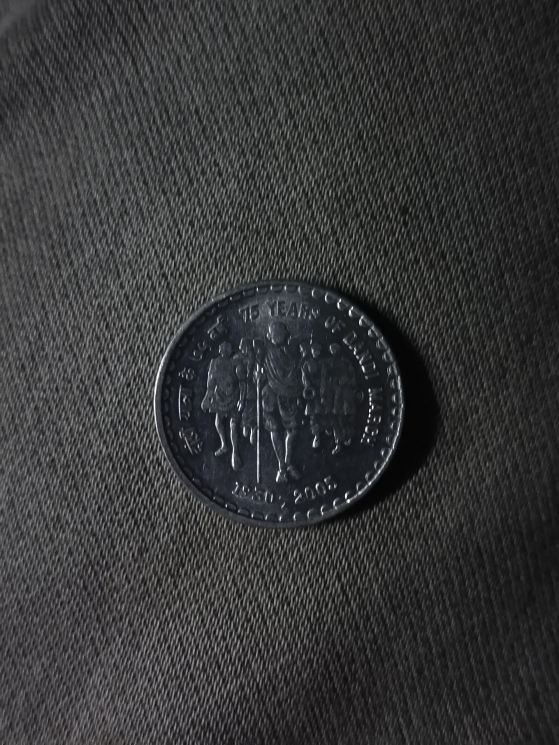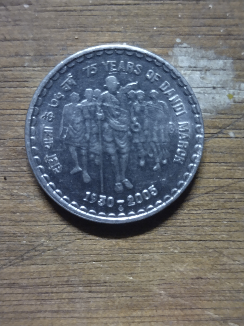 The image shows a commemorative Indian 5 Rupee coin issued in 2005 to mark the 75th anniversary of the Dandi March