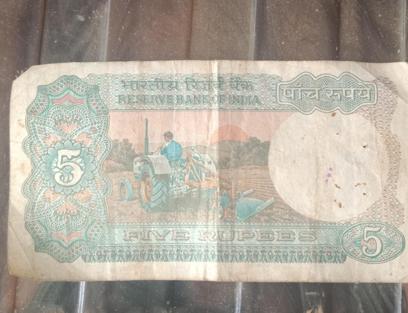 An old 5 Rupees note with tractor and farmer!