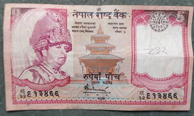 5 Nepalese Rupees (NPR) banknote featuring a portrait of King Gyanendra Bir Bikram Shah.