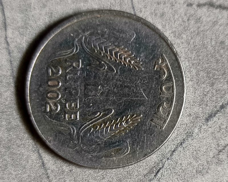 This is an original 1 Rupee Indian Coin from the year 2002, featuring the classic Wheat Ear design.