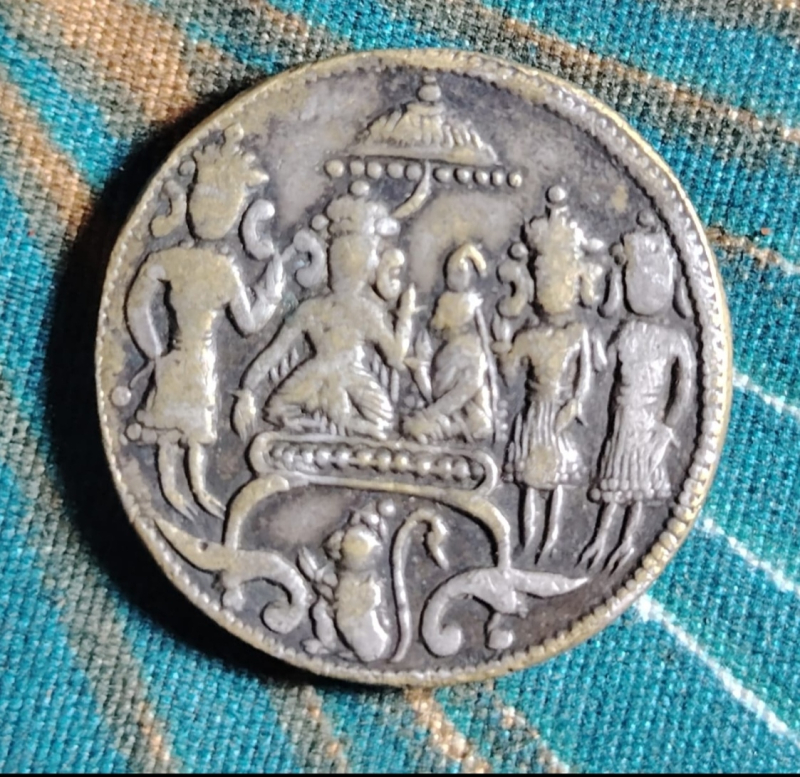 This is a rare and authentic old Indian religious coin, featuring beautifully engraved Hindu deities and temple-style artwork on both sides. The detailed craftsmanship and traditional iconography indicate its antique nature, making it highly desirable among coin collectors, antique lovers, and spiritual devotees.